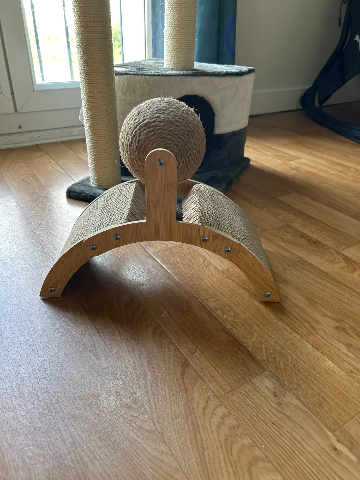 Dieses clevere Kratzspielzeug kombiniert stilvolles Design mit funktionaler Krallenpflege. Der stabile Sockel aus Kiefernholz sorgt für sicheren Halt, während der robuste Sisalball Ihre Katze zum Spielen, Kratzen und Toben einlädt – ganz ohne Schaden an Ihrer Einrichtung.