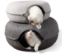 Dieses einzigartige Katzenbett kombiniert Komfort, Spielspaß und Design in einem. Dank seines cleveren Donut-Designs dient es gleichzeitig als Schlafplatz, Tunnel und Versteck – ideal für ein oder zwei Katzen, die gern kuscheln, spielen oder einfach entspannen.